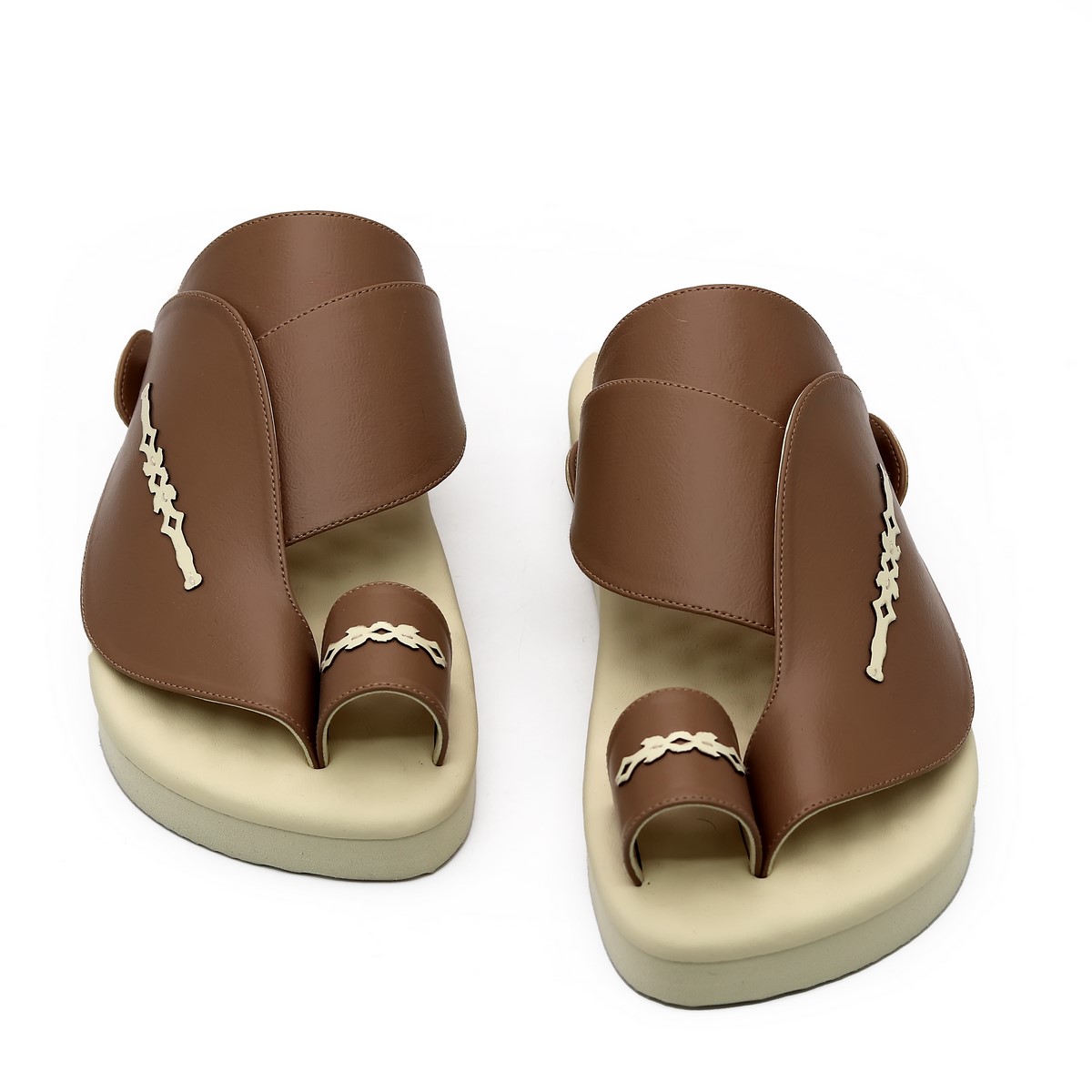 نعال سعودي فاخر وطني بني مصنوع من جلد طبيعي عالي الجودة، يوفر تجربة ارتداء مريحة طوال اليوم. يعتمد على تقنية أرضية المناطق الخمس الألمانية التي تمنح ثباتاً مثالياً ودعماً متكاملاً للقدم أثناء المشي.